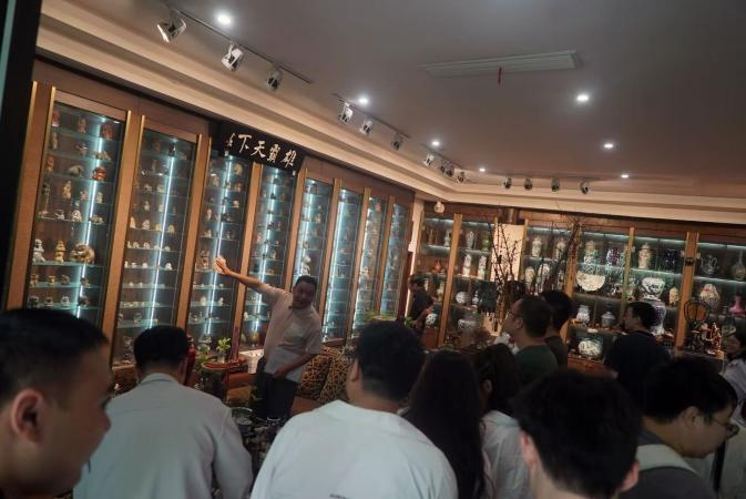 天藝濃園藝術(shù)博覽園以歷代名家字畫、瓷器、玉器、銅器等藏品展示為媒介,架設(shè)起文化技藝今古對(duì)話的橋梁。濃園聯(lián)合黨支部書記李兵,帶領(lǐng)大家探訪園區(qū)特色文化空間。從品茗休閑的雅致茶境,到非遺傳承的匠心展臺(tái);從文創(chuàng)設(shè)計(jì)的巧思之作,到文博收藏的歷史瑰寶,不斷沖擊年輕科技從業(yè)者的認(rèn)知。